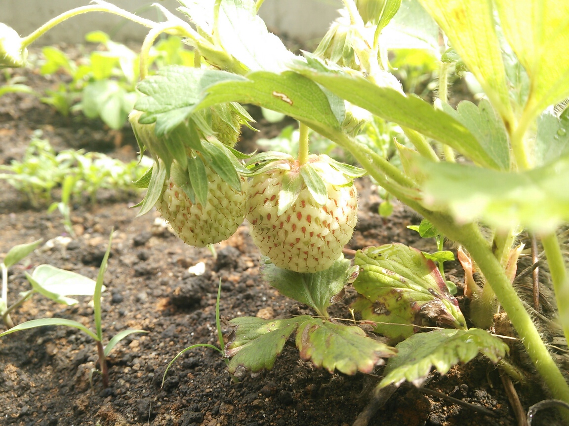 こちらのイチゴは頂きものの苗が越冬したもの。色が抜けたのではなく、白いイチゴらしい。イチゴのアルビノ!?
