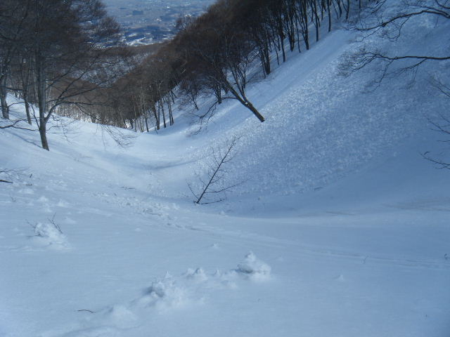 そのあと、沢の南は雪崩跡満載。なるべく左岸に寄るように滑降。