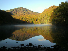 赤沼の湖面は風もなく、鏡になって山の紅葉を映していました。