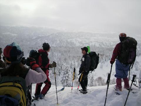 スノーシュー、スキー、スノーボード(私だけ)の混合チーム。