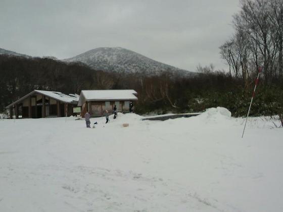 偶然酸ヶ湯の上の駐車場で遭遇した天空狂会のみなさんにご挨拶しに行ったらなんと、ご親切にも板を貸してくれたので、 ※注:YOKOは今回、スノーボードをおうちに置いてきています