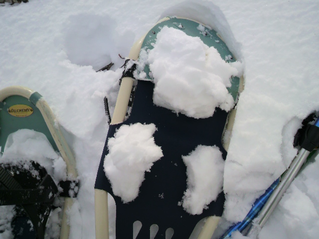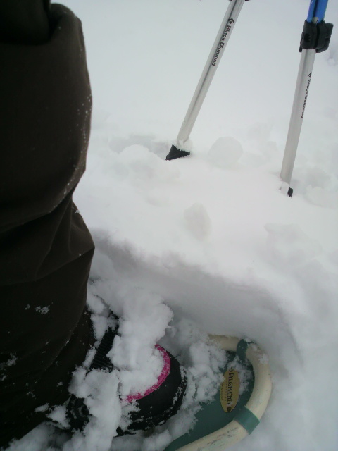 しかーし、雪が重い。スキーのあととはいえ、シューは沈みがある。結局深いラッセルと変わらねーし。w