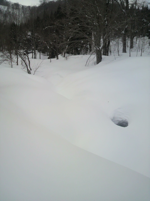登りのトレースに逃げても無駄だった。しばらくワンフットで進んでだら、そのまま埋まっている木の枝に引っかかってしまい、変な方向へ足が向いてしまうなど。危うく骨折寸前でした。