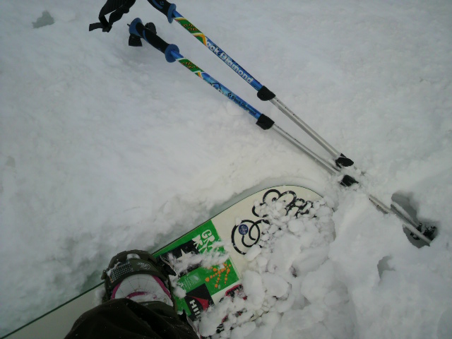 ところがどっこい!中間より下はノートラ斜面でもズボズボズボと板が埋没。身動きとれずポールを出すも、それでも埋まりまくり。