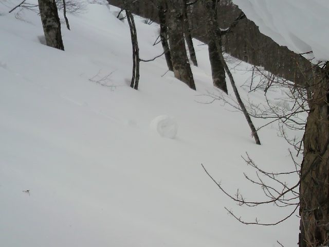 斜度もけっこうあり、多少の湿雪でも止まることはない。
