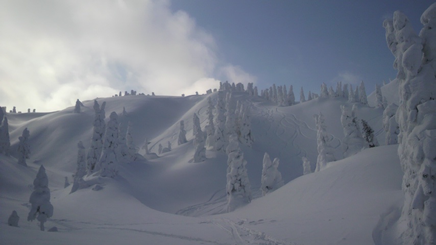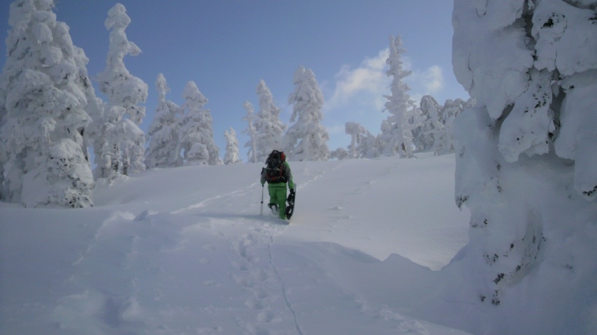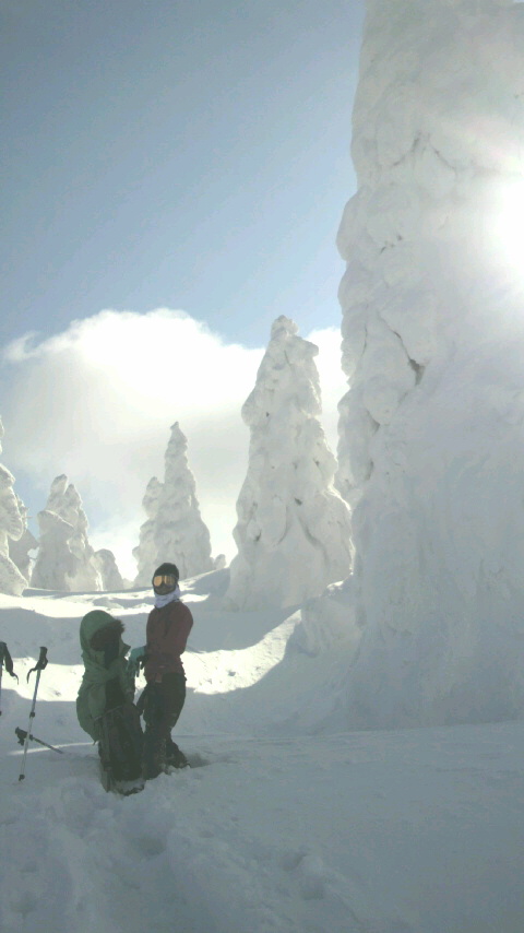 一部急な登りもありーのでモンスターな樹氷を縫って鳴沢台地へ。