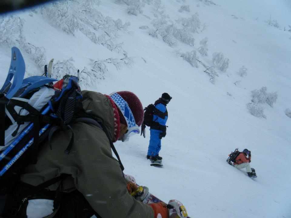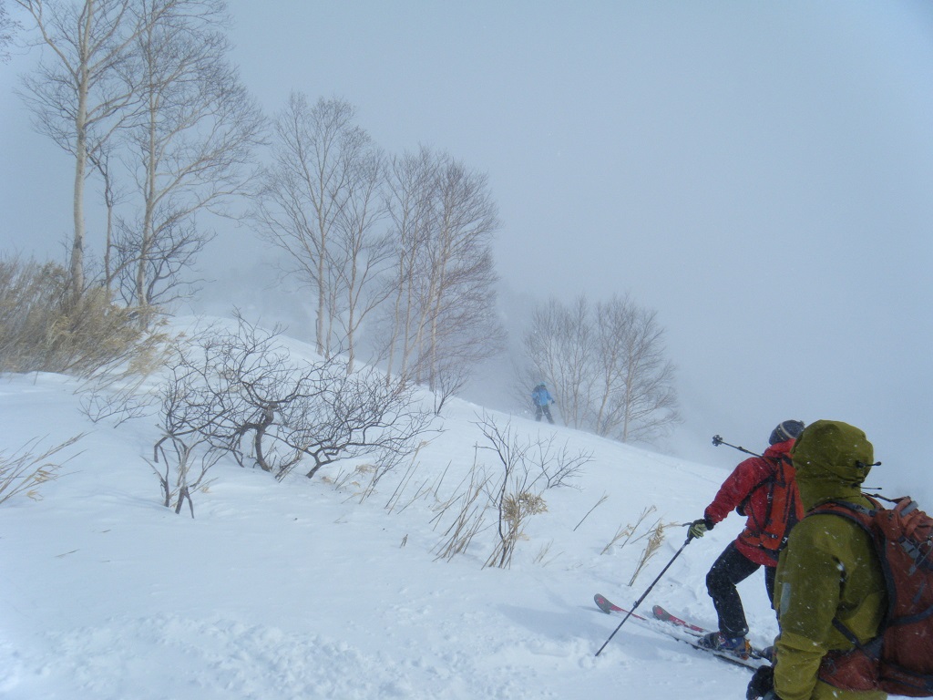雪崩を避けながら、風をよけながら、とりあえずまとまった立木のある地点で、滑走開始することに。