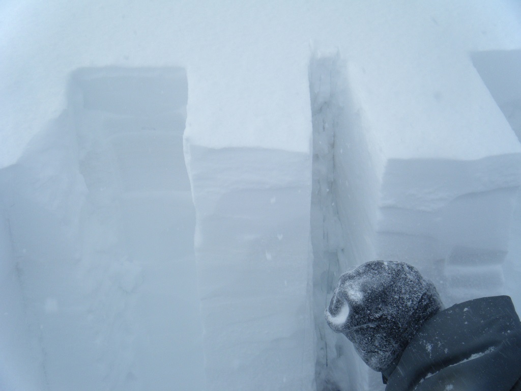 ここで習得したのはショベルを上から叩いて行うコンプレッションテストと、30cm角の雪をショベルですくって下からトントン叩いてすべり面を確認するバーブテスト。