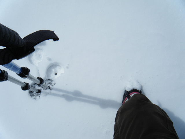 最初のフラットな登りではグループまとまって、間隔をそれほど開けずに進むが、雪崩の走路では間隔をなるべく開けて横切ったり(間隔あければあけるほど、万が一雪崩れた時のリスクは少なくなる。少なくとも10m以上は)、沢状地形での登りも、アンカーの木のあるところ、雪崩の発生区となるところ見ながら、また歩きながらストックやプローブを出して雪の状態を確認しながら進む。場所によって、硬い層の深さが全く違う。講師さんが「地形を見ろ」と何度もいう理由もわかってきた。