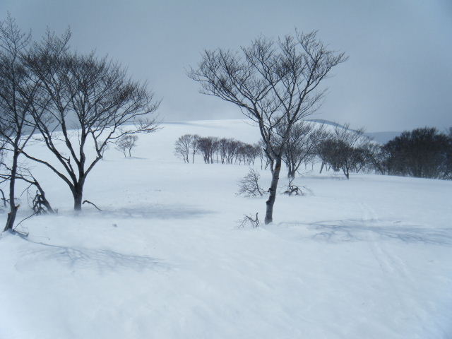 当初の目的地は大黒森だったけど、爆風につき第二リフト降り場跡地でやや引き返しすることに。