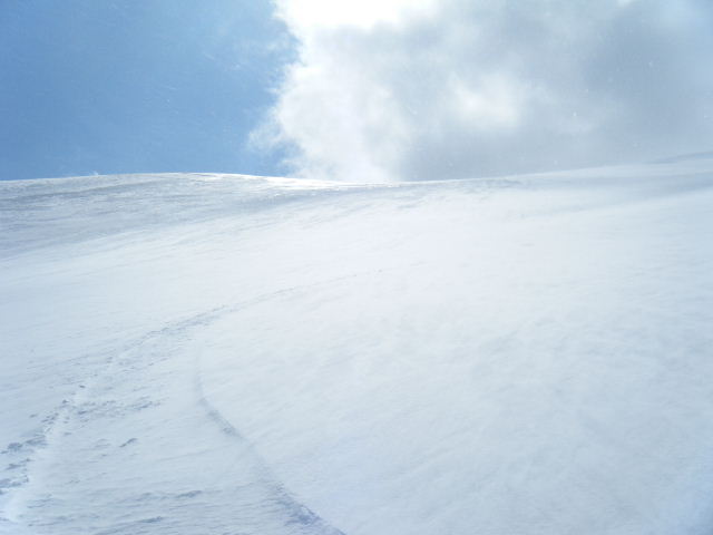 その後、ちょっとは上まで行けるか試みたけど、強風すぐるしクラスト気味のアイスで足をとられるし、諦めてここで滑走開始することに。