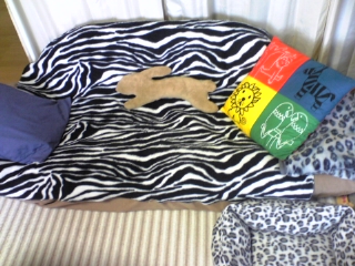 YOKO愛用のローソファーにゼブラの布をかぶせました。