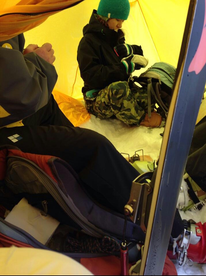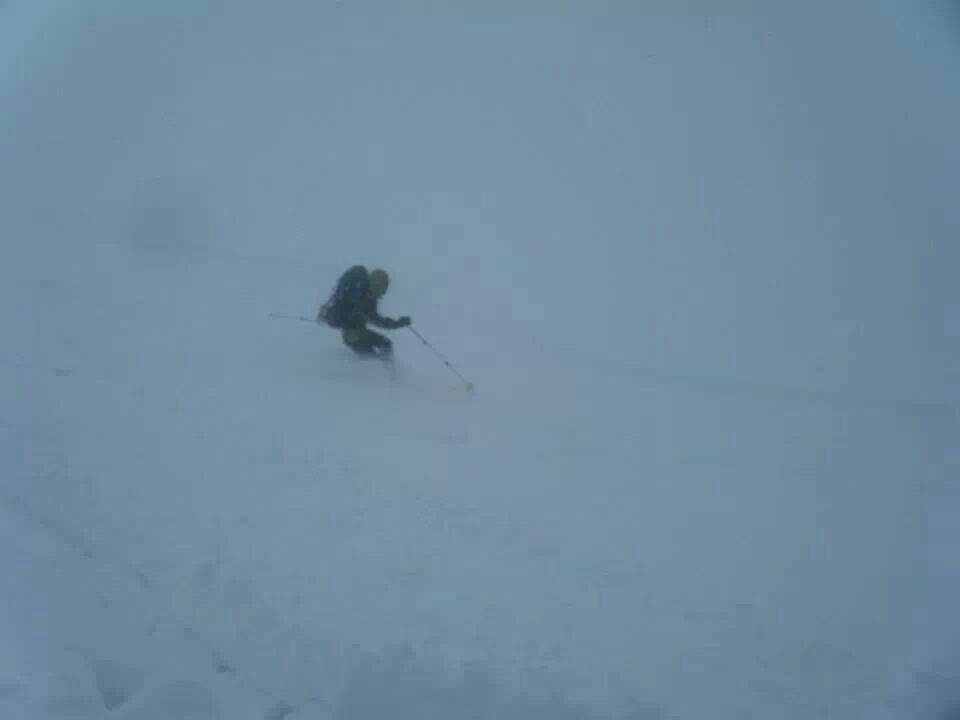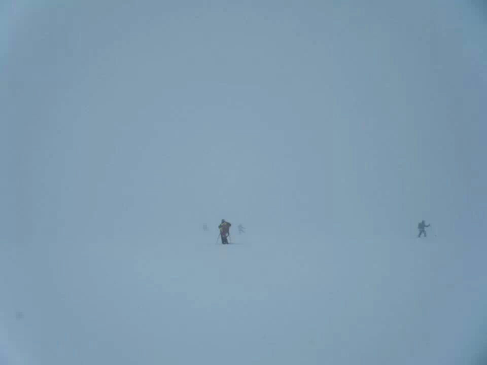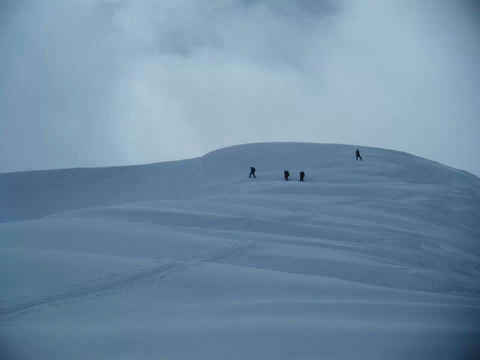 急斜面を滑落寸前トラバース、小さなクレバス落下未遂。標高高くシュカブラのうえにうっすら新雪が乗っててシューではかなり困難。途中でシューを脱いで、スキー隊に預かってもらいながらツボ足で進むと割とスムーズに行けた。