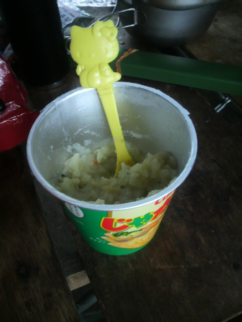 そしてみなさんも起きたところで、じゃがりこポテサラを試食。