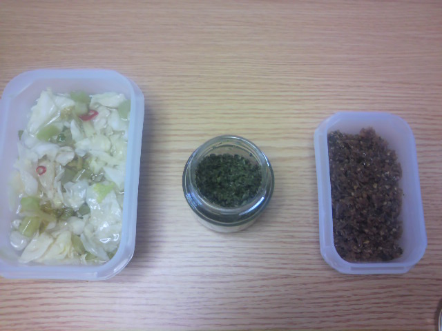 左から、 ①キャベツと大根の葉っぱの漬物 ②山椒胡椒(青唐辛子) ③辛子ちりめん
