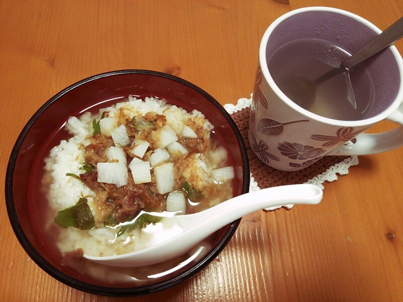 『ゆず茶と、長芋としば漬けのお茶漬け』ひとりご飯だから簡単に。かつお節を煮立てて、さいの目切りの長芋を入れて、最後に少量の塩で軽く味付け。丼にご飯の上に、しば漬けとしそを散らしておく。煮立った長芋のだし汁をかつお節を取らずにそのままかけて、出来上り。ゆず茶は市販のものにお湯を注いでおしまい!今日も映画みてのんびり過ごすと決めた☆