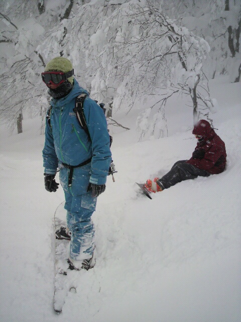 雪崩を避けながら、風をよけながら、とりあえずまとまった立木のある地点で、滑走開始することに。