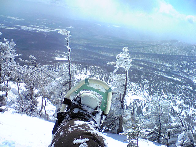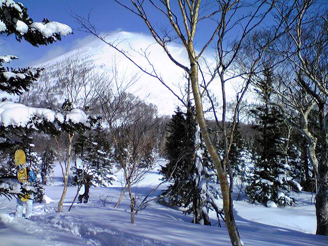 ハイマツがまばらになった、山頂に手が届きそで届かない辺りから登ったトレース脇のノートラ大斜面を滑りましたよ~